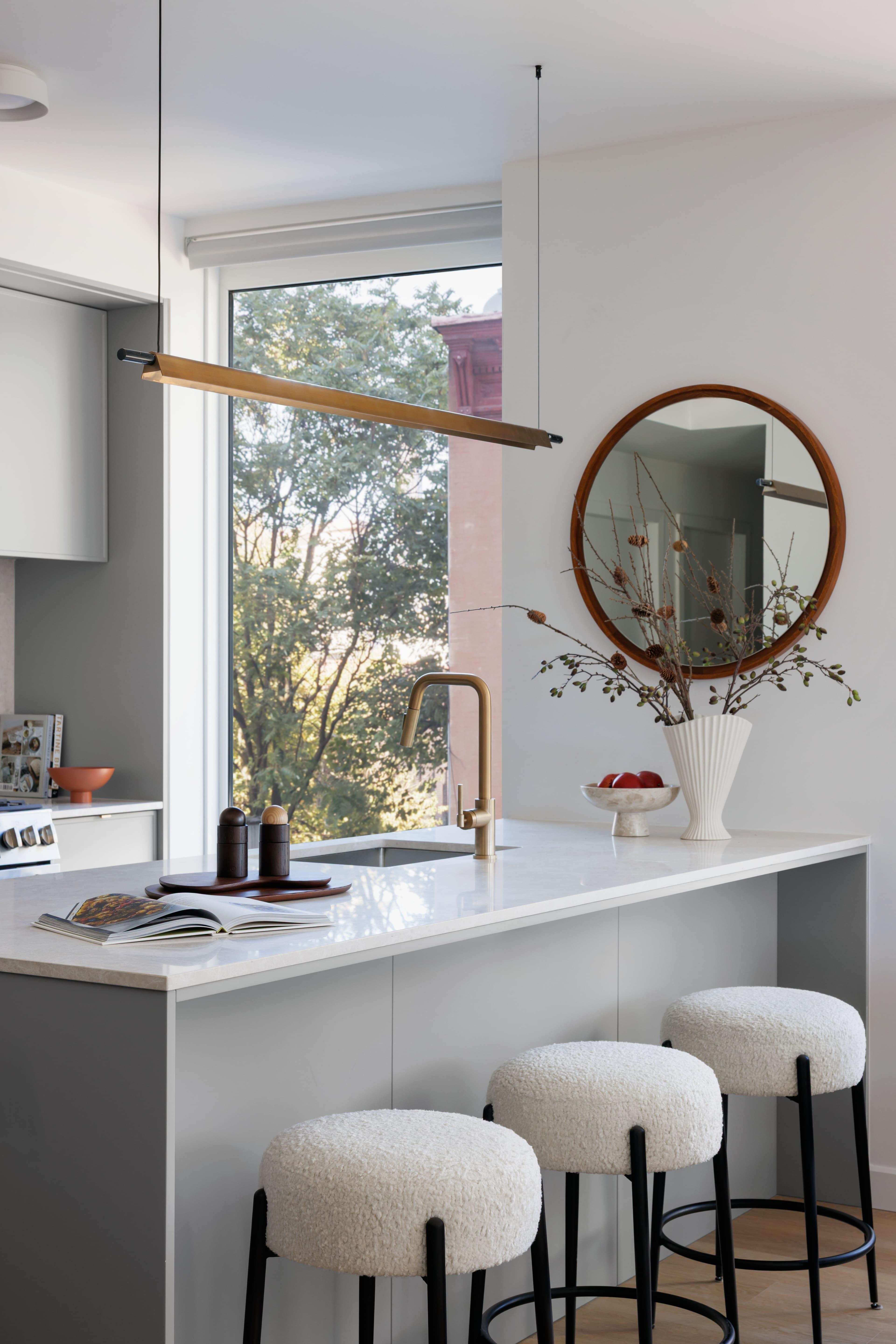 Comprising 133 family-sized residences, the homes at 544 Carroll are thoughtfully designed for comfort and functionality, featuring open layouts, oversized nine-foot windows, and ceiling heights up to 11 feet that invite abundant light and air. Residences on the upper levels enjoy skyline views of Manhattan and beyond, while those on the lower levels are directly embedded into the neighborhood with charming townhouses and tree-lined vistas. Kitchens are designed for entertaining, featuring oversized marble islands, custom European cabinetry, paneled top-of-the-line appliances, and satin brass fixtures. In-unit washers and dryers, custom window shades in every room, and smart, energy-efficient heating and cooling systems offer everyday convenience. Select homes include double vanities, walk-in closets, freestanding tubs, and expansive private terraces.