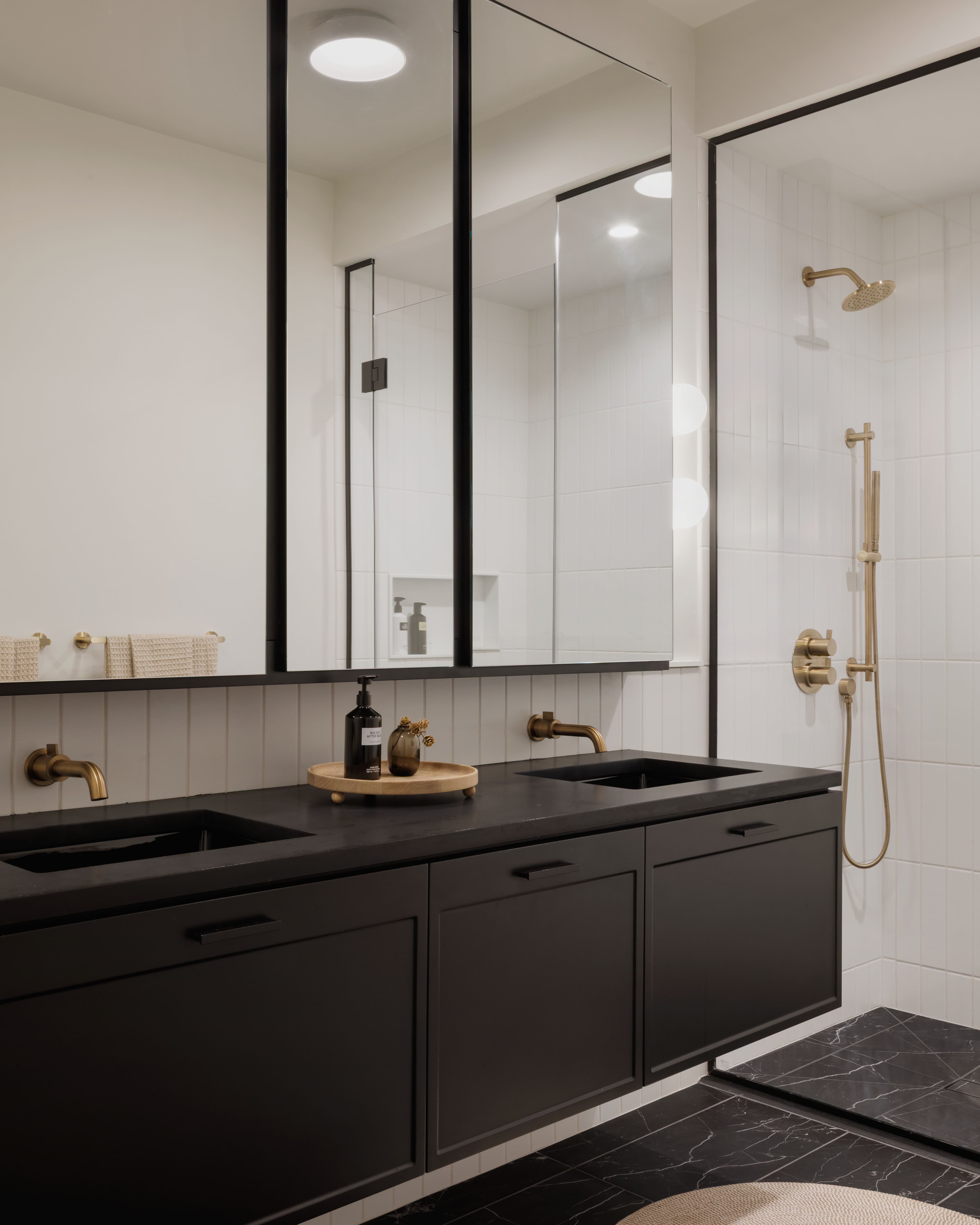 At 544 Carroll, every bathroom is a retreat—thoughtfully designed to transform the everyday into a spa-like experience. Soaking tubs, glass showers, and thoughtful touches like shower niches and handheld wands invite a moment of calm. Custom matte lacquer European vanities, polished nickel fixtures, and pendent lighting set a serene tone, while oversized medicine cabinets with hidden outlets keep the clutter tucked away—balancing beauty with ease.